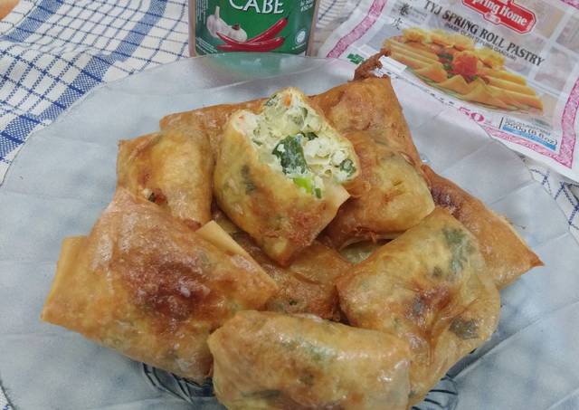 - ambil selembar kulit lumpia, masukkan 1 sendok makan campuran telur, lipat kulit dan bentuk seperti lipatan amplop. lakukan sampai campuran telur habis.